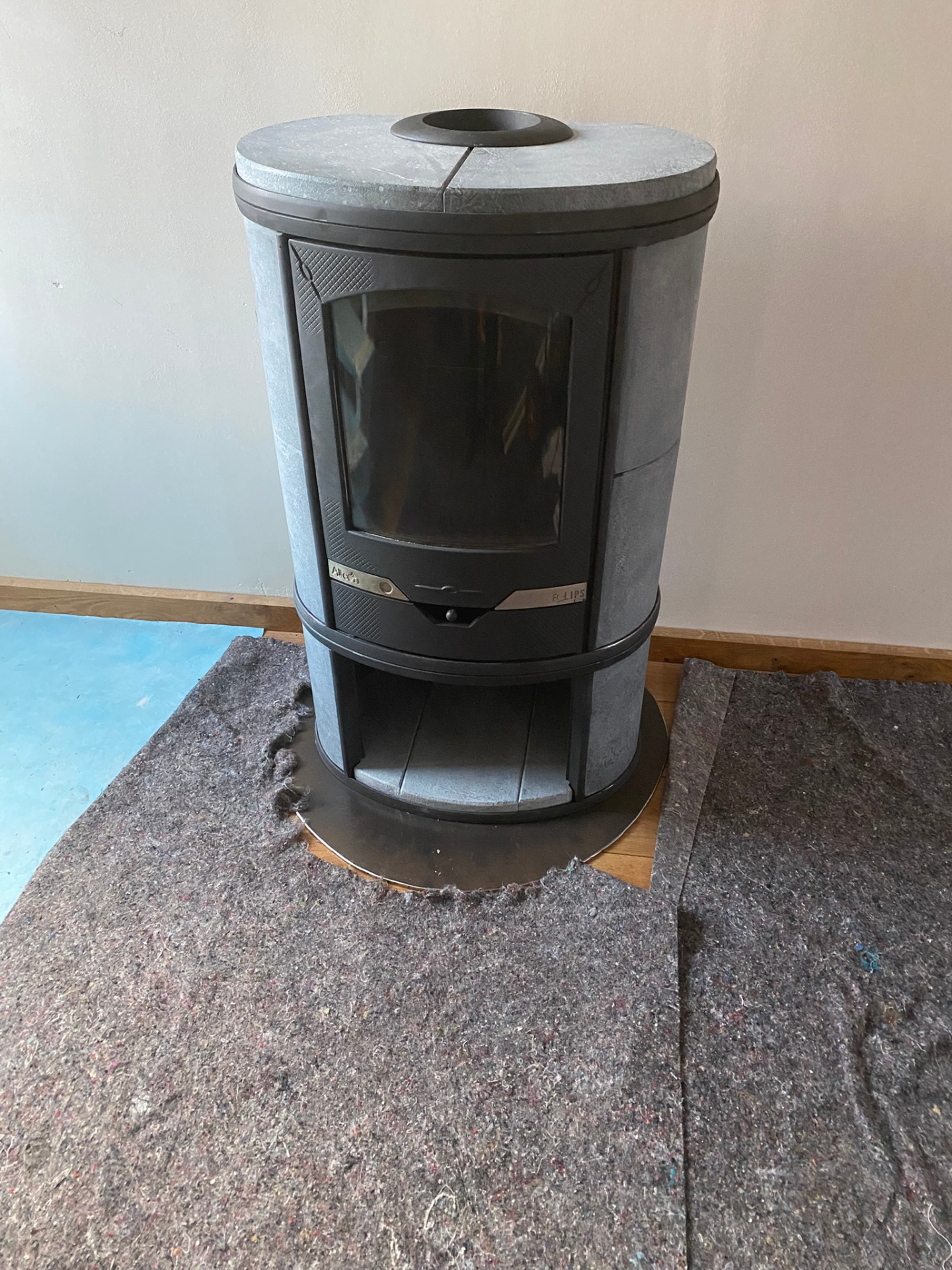 Een toonzaalmodel speksteenkachel(tje) zal voor onze gezellige warmte zorgen. Met de 10kw zal ze ruimschoots de nodige 3Kw aankunnen. De kachel was volledig in het zwart geschilderd, wat voor ons als echte speksteen liefhebbers een doorn in het oog was. Bij thuiskomst met de kachel heb ik onmiddellijk de koe bij de hoorns gevat en alle zwarte verf van de speksteen geschuurd zodat de schoonheid van de speksteen opnieuw in volle glorie kan schitteren. Een rest metaalplaat uit mijn atelier, wat plasma-snijwerk, opschuren en de vloerplaat kon gelegd worden en de kachel geplaatst. Nu nog wachten tot de juiste kachelpijpen binnen komen.