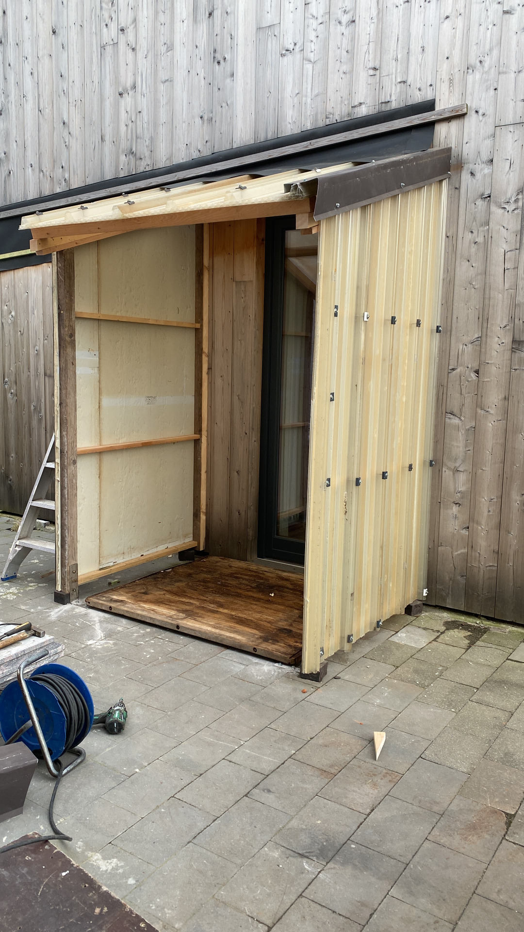 Aan de achterdeur moet er later nog een soort sluis komen zodat we niet rechtstreeks met de deur in huis vallen, vooral dan met onze vuile natte botten onmiddellijk het hele huis bevuilen. Met allerlei restmateriaal en pallethout timmeren we een afdakje.